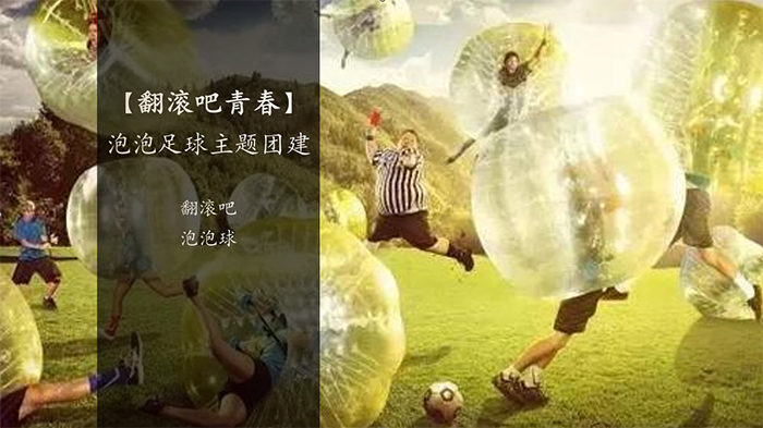 【翻滚吧青春】泡泡足球主题团建 翻滚吧青春 翻滚吧泡泡足球 关键词:互动趣味、释放压力、挑战自我 泡泡足球是一种源自丹麦,刺激且好玩的新趣味运动,参与者把自己套进大气球中,整场比赛每个人在场上两滚带摔也不用担心受伤,这项风靡欧洲、日本等地,运动和娱乐效果兼具的团队竞技活动,现在已经成为团建竞技活动的新风潮。