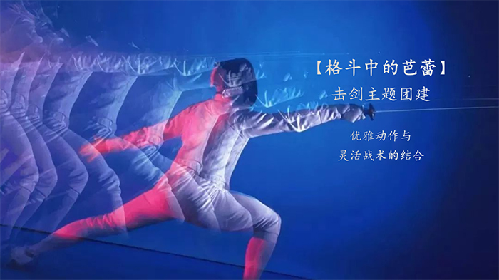 【格斗中的芭蕾】击剑主题团建 优雅动作与灵活战术的结合 关键词:自信、自控、优雅灵活 击剑(Fencing)是从古代剑术决斗中发展起来的一项体育项目,它结合优雅的动作和灵活的战术,要求运动员精神的高度集中和身体的良好协调性,体现出运动员良好的动作和敏捷的反应。 通过体验式学习模式,结合击剑体验课程,完成对时尚运动击剑的了解与基本技术的掌握,同时在培训师的引导下对击剑运动延展出的动商、情商、健商、智商、及德商多元化多维度训练,强化自我管理能力与团队协作。