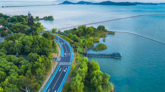 烟波浩渺的太湖,是中国五大淡水湖之一,湖岸线曲折蜿蜒,小桥流水,绿树人家,稻香桑茂,渔港,村落,古桥,古镇连成一片,构成了一个个千姿百态的天然山水画面。沿着苏州太湖骑行车道徒步,别有一番感受。