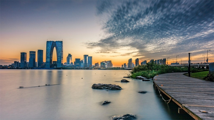 苏州金鸡湖景区位于苏州工业园区西部,金鸡湖景区是国内少数对外免费开放的国家5A级景区之一。景色宜人、环境舒适休闲,适合环湖徒步,环苏州金鸡湖约16公里。