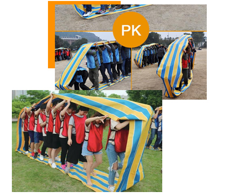各队派出10名队员参赛,利用运输带相互配合转动器材,将小队的所有人从起点带到终点,中间采用小组竞赛形式,每个小组的队员在行进过程中必须通过团队的协调配合将运输带向前行进,以各参赛队所用比赛器材触及终点线所在垂直平面为计时停止,用时最短的获胜。